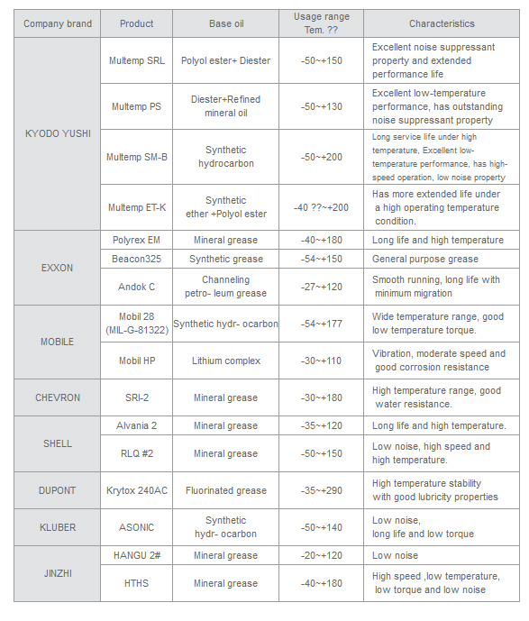 There are so many types of grease available for the ball bearings in Farton Mitex .According to the different working environment and operating conditions of bearings, Farton Mitex lists the below chart to recommend some regular grease to help customers to choose for bearings.Besides the below types of grease,Farton Mitex will fill other types of grease according to customers' requirement.